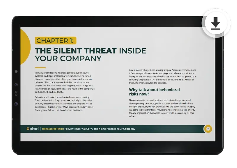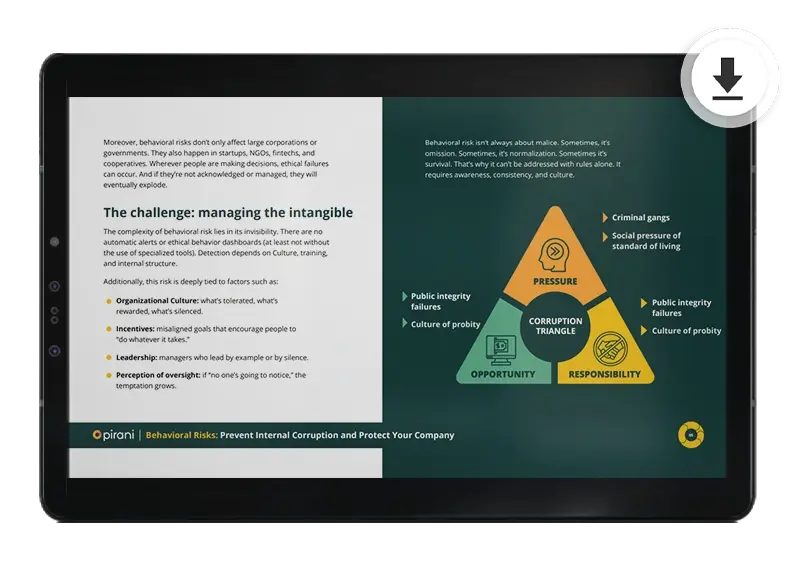 In this free eBook, Behavioral Risks: Prevent Internal Corruption and Protect Your Company. Learn how behavioral risks can affect your business and discover effective strategies to prevent internal corruption. Here we share practical tools and key tips to protect your organization from the inside.