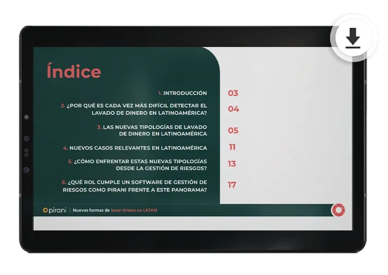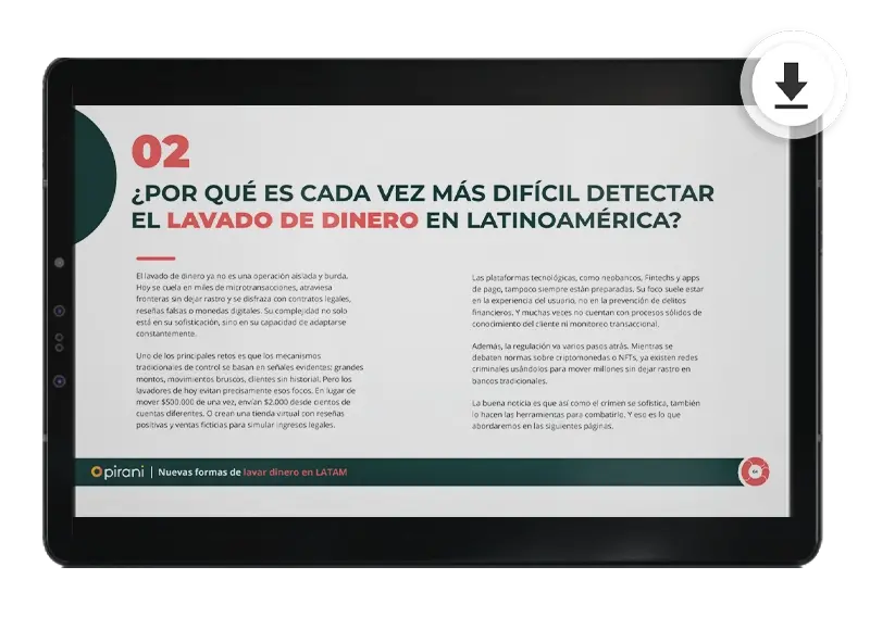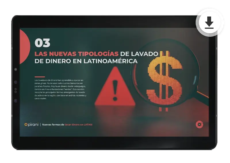 Completa el formulario y accede gratis a este ebook de Pirani y detecta las nuevas formas de lavar dinero en Latam para que protejas tu organización.