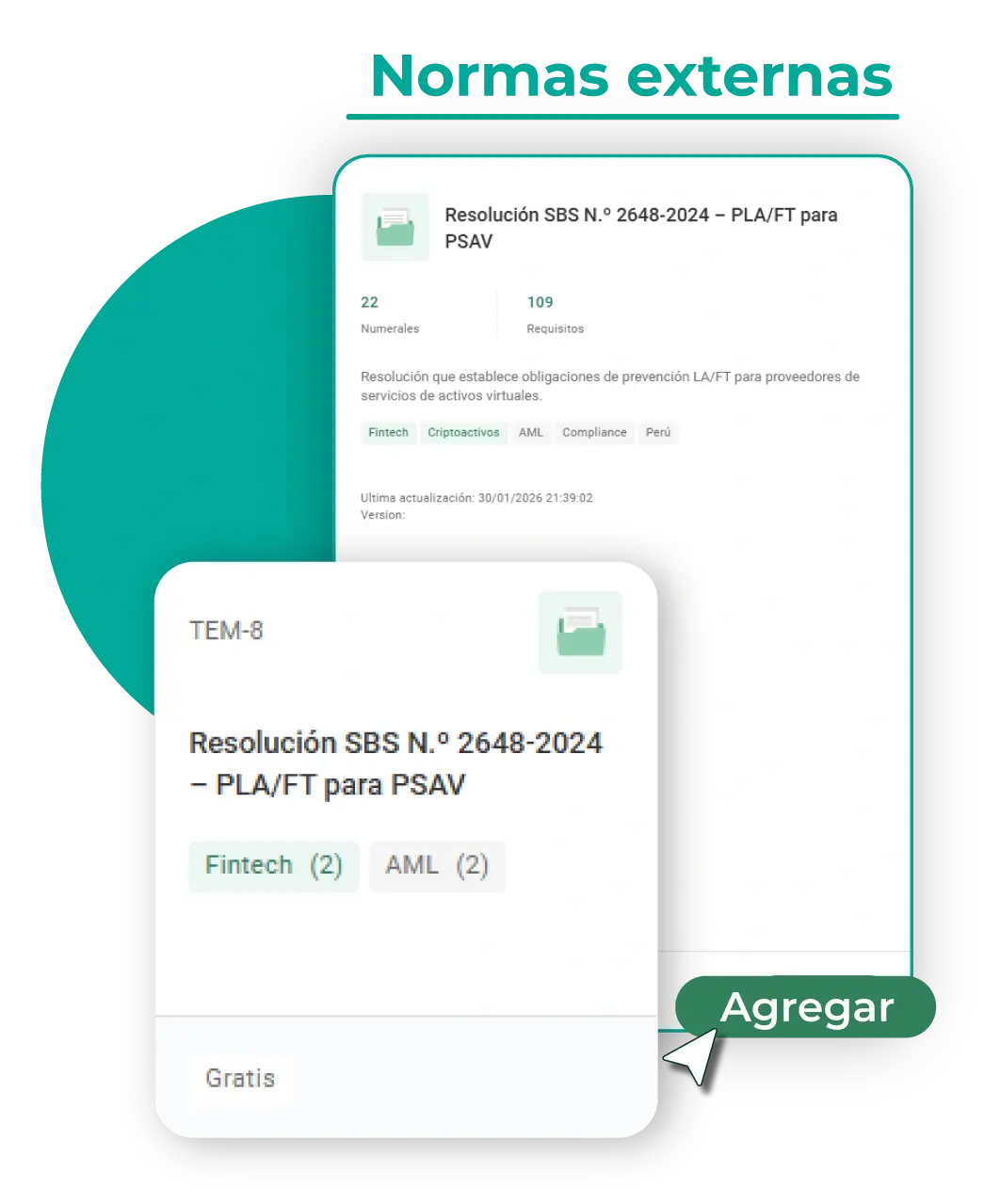 Pirani te trae el catálogo de normativas externas preconfiguradas, gratuitas y próximamente de pago, sin necesidad de crear normativas desde cero. Accede a estándares oficiales, mantente actualizado ante cambios regulatorios y enfócate en el cumplimiento.